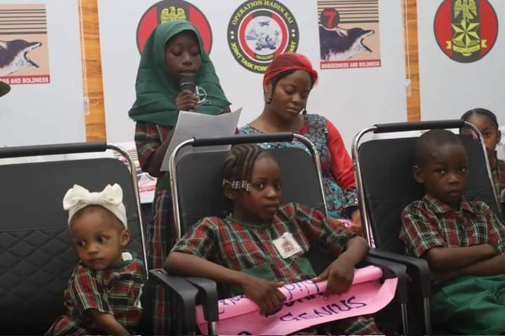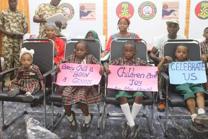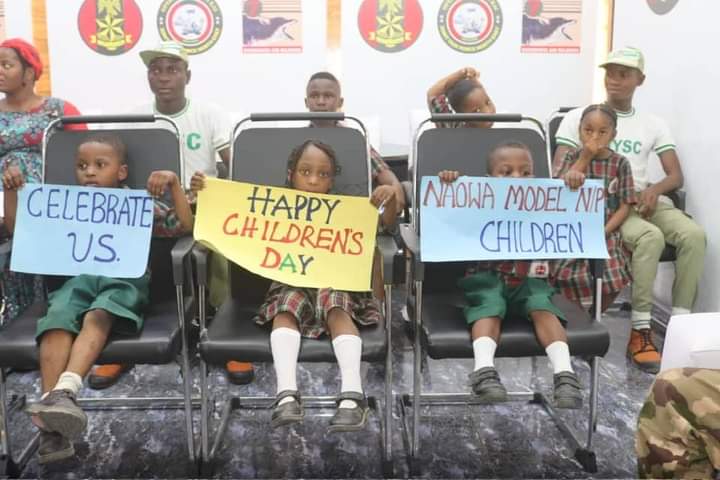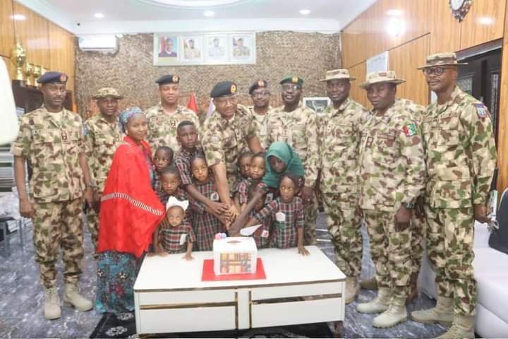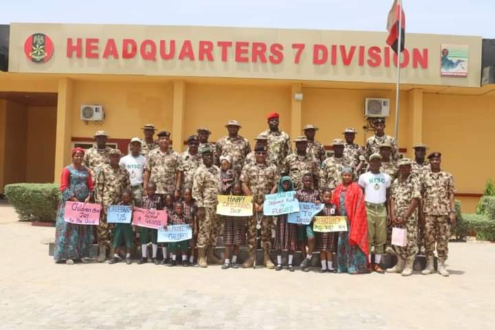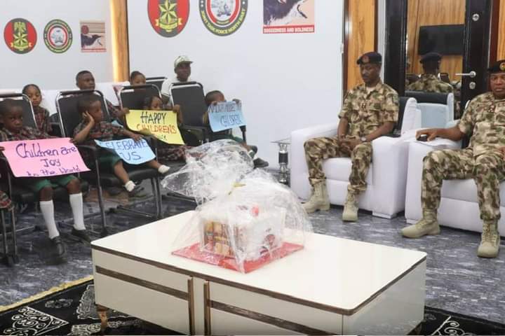 CHILDREN’S DAY CELEBRATION: GOC ADVISES PUPILSThe General Officer Commanding 7 Division Nigerian Army and Commander Sector 1 Operation HADIN KAI Major General Abdulsalam Abubakar has advised young pupils to embrace the virtues and values of discipline, courage and honour as foundations for a successful life.The GOC gave the charge when pupils of the Nigerian Army Officers’ Wives Association,(NAOWA) Model Nursery and Primary School Maimalari Military Cantonment Maiduguri paid him a courtesy visit in his office as part of activities organised to mark the 2023 Children’s Day Celebrations.General Abubakar who described Children’s Day as a special day set aside to celebrate the incredible and mind-blowing potentials that reside within children affirmed that he had witnessed firsthand, the strength, resilience and determination that children possess. He said the Day was not only a day of celebration but also a reminder of the responsibilities parents have towards the younger generation, hence it was duty bound on adults and mentors to give the necessary guidance, support and opportunities to nurture their talents in order to achieve their dreams. The GOC urged the children to make a difference in the world and not to underestimate their abilities or the impact they could make stressing that the path to success may not always be easy but rather, they should keep pushing forward and believe in their abilities to overcome any obstacle. The GOC commended the teachers and parents for their dedication, energy and love towards nurturing and educating the children.A pupil by name Hassina Lawan who spoke on behalf of the pupils, appreciated the GOC for his support, fatherly love and care for the school children. She promised that the children will continue to be focused on their studies as future leaders.Also, the School Head teacher, Mrs Zara Mustapha in her remarks, promised that as teachers, they would keep imparting sound and quality education to the pupils as well as teaching them good morals to enable them become good leaders and worthy members of the society.Highlight of the visit was the cutting of the NAOWA Model Nursery and Primary School Cake to mark the 2023 Children’s Day.